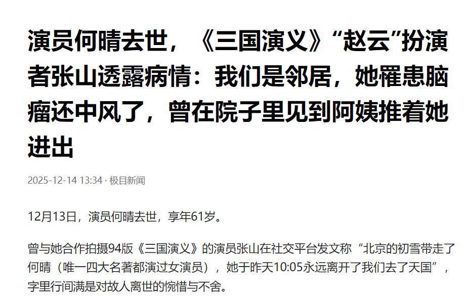 12月14日,文娱圈突传凶讯,著名女星、有“古典第一好意思女”好意思誉的何晴灾祸升天了。