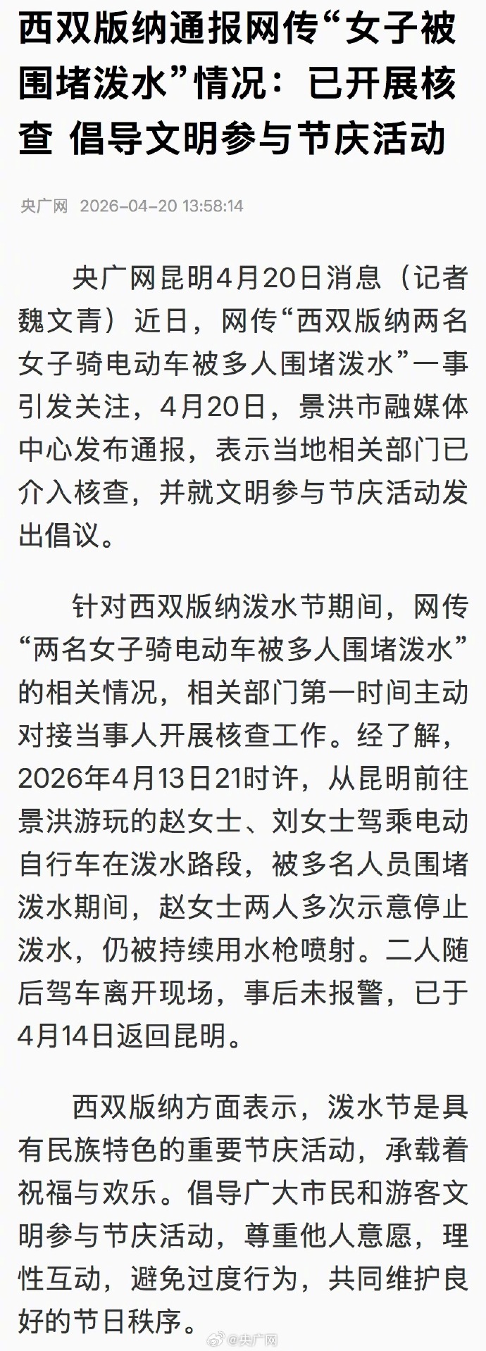 近日,网传“西双版纳两名女子骑电动车被多东谈主围堵泼水”一事激勉温顺官方,4月20日,景洪市融媒体中心发布通报,暗示当地有关部门已介入核查,并就好意思丽参与节庆算作发出倡议。